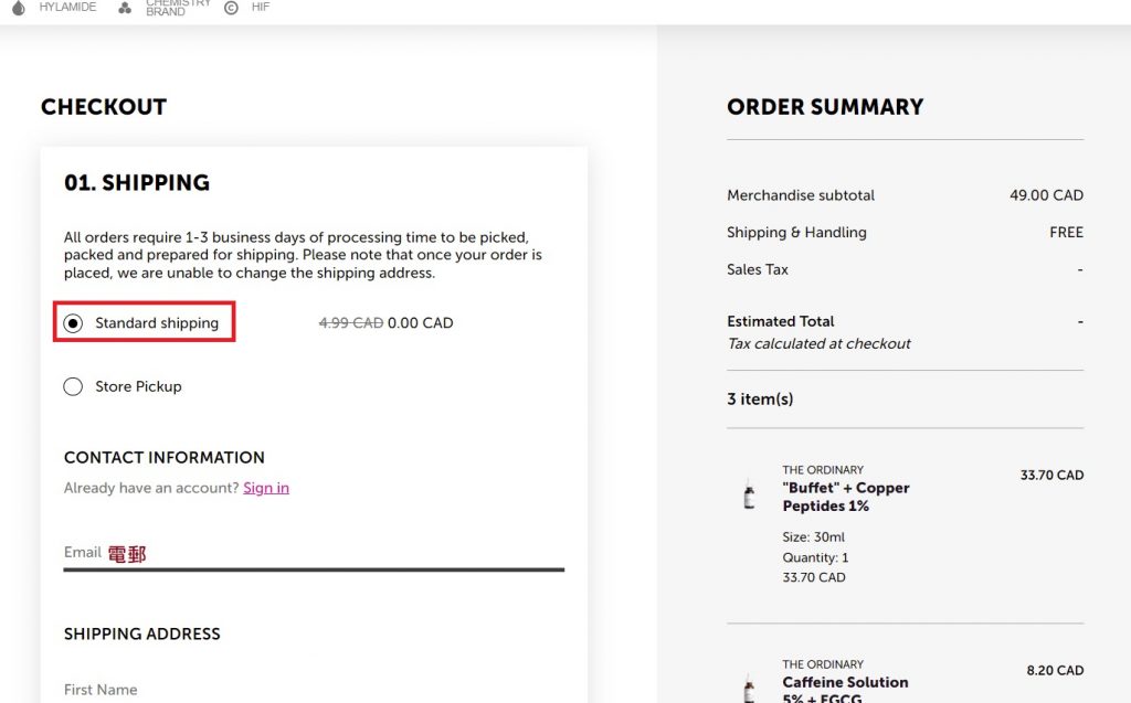 Step 3:派送方法要點選「Standard Shipping」,然後開始填寫個人資料,先填上你的電郵地址。