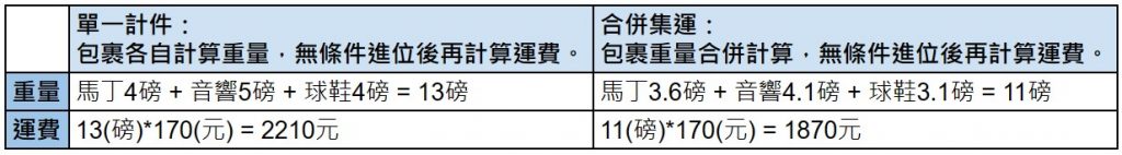 小編還要提醒大家,由於不同國家的代運運費不一樣,所以合併貨件的轉運單運費會以運費價格最高者為準,來計算整張轉運單的每磅運費。因此,建議相同運費國家的貨件合併一張轉運單,不同運費計價則不建議合併。如運費 1 磅新台幣 170 元 與 運費 1 磅新台幣 120 元的貨件合併,轉運單運費會以高價 170 元計算運費,即是收取 2 磅運費合計新台幣 340 元。