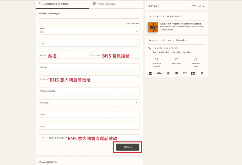 Step 4: 打開 Buyandship 網站的「海外倉庫地址」並選擇「意大利」,然後複製 Buyandship 意大利倉庫的資料並填上適當位置,完成後點擊「保存」。