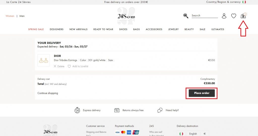 Step 2:點擊右上角購物籃標誌進入購物車,檢查訂單後按「Place Order」。