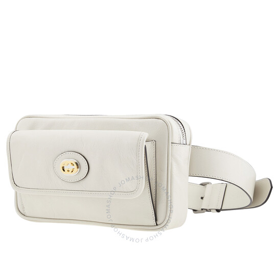 白色皮革雙 G 標誌腰包,非常特別,戴上後可以空出你的雙手,正面設有翻蓋口袋,主隔層則用上拉鍊開合,腰帶可調節長度。