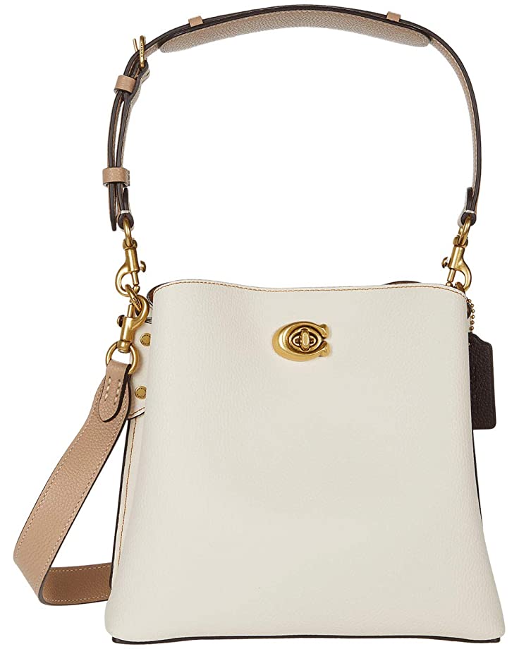 如果追求大容量的包包,就一定要入手水桶包!近年超夯的白色水桶包,拼色拋光鵝卵石皮革製成,用上白包拼燕麥色皮革,正面飾有標誌性旋鎖閉合扣。