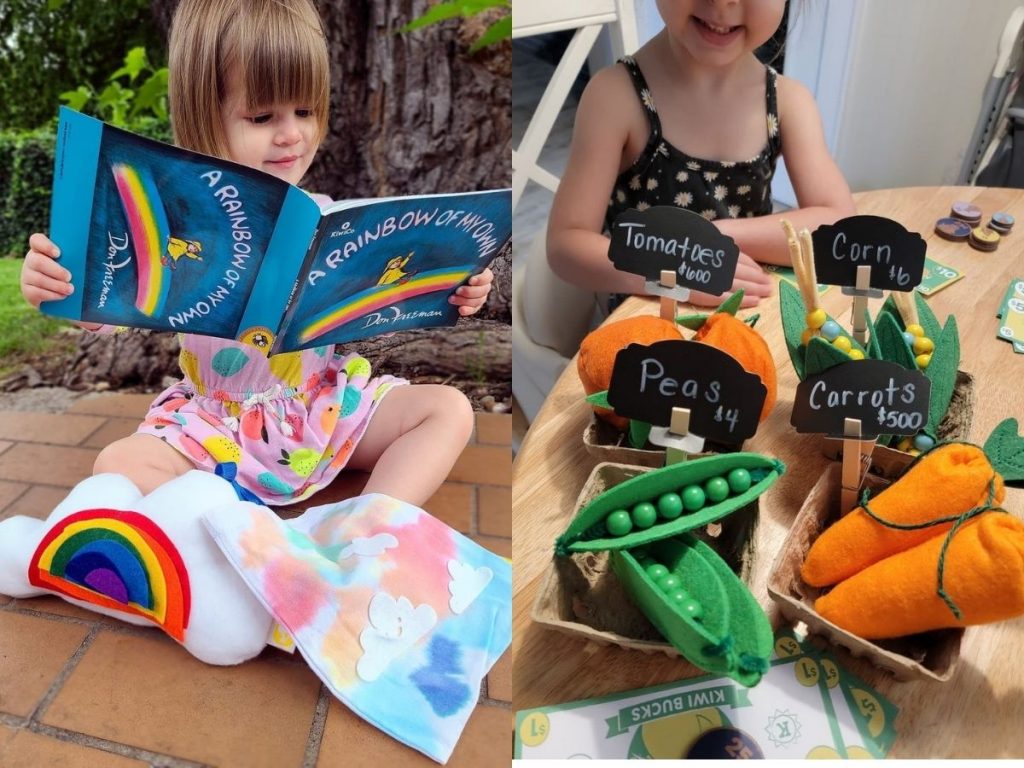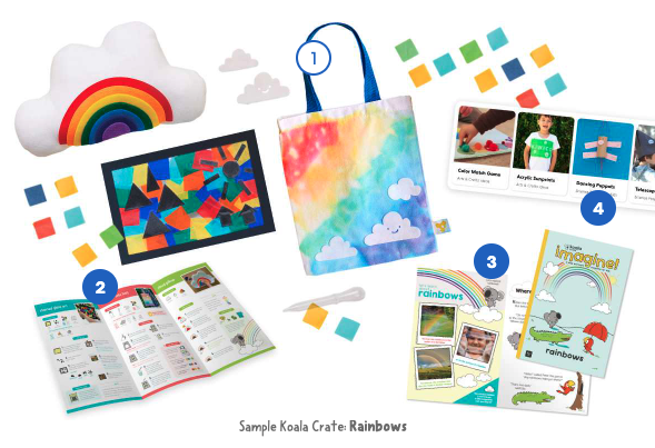 探索彩虹是如何形成的,使用彩色正方形和山和樹的剪裁形狀創建彩色玻璃景觀。通過設計和染色彩虹手提袋來探索顏色混合,及將絨毛塞入雲枕~