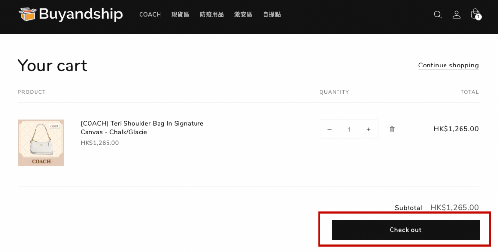 Step 2:完成選購後,點擊網頁右上角的購物袋進入購物車,確認商品無誤後點擊「Check out」。