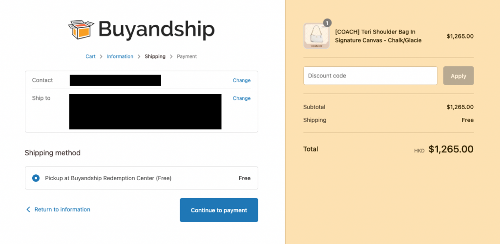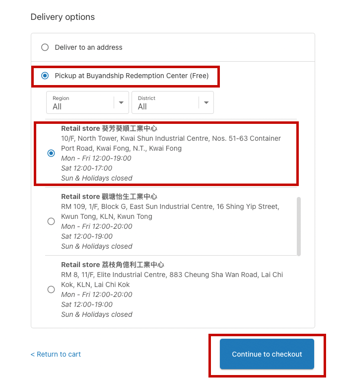 Step 3:選擇第二項「Pickup at Buyandship Redemption Center」,然後選擇「葵芳葵順工業中心」,千萬別選錯喔!
