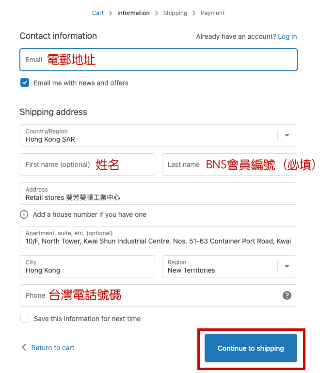 Step 4:填寫你的電郵地址、姓名、BNS會員編號及電話號碼,然後點擊「Continue to shipping」。