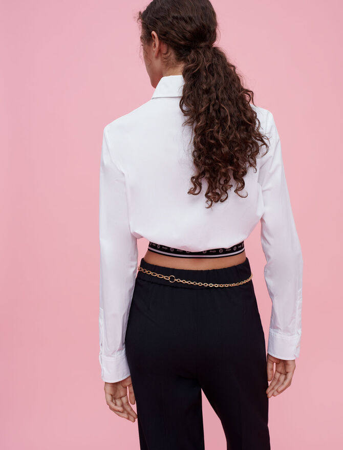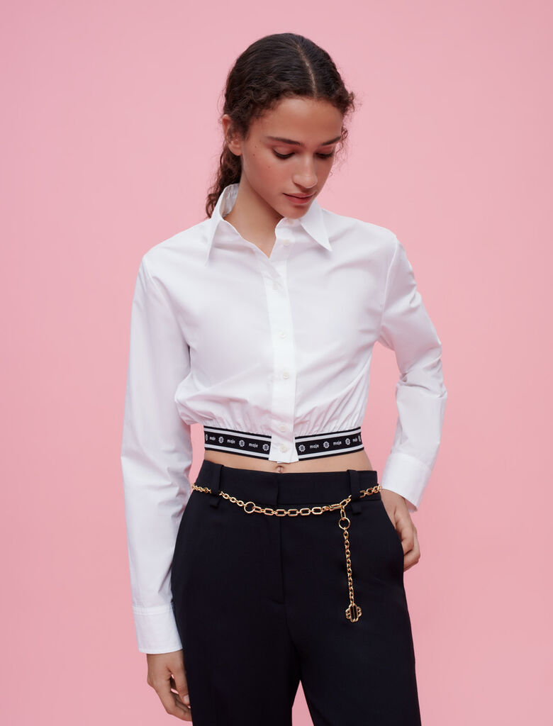 這款短版襯衣底部設有彈性腰帶,能貼合腰部突顯典線,一改普通版型襯衣的臃腫感覺;以黑白拼色品牌名字和 Maje Clover 標誌,配搭純白色襯衣,外型簡約俐落,配合黑色長褲穿著更時尚好看。