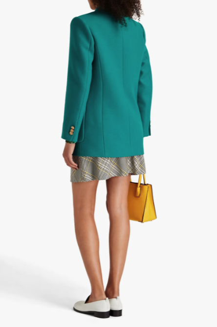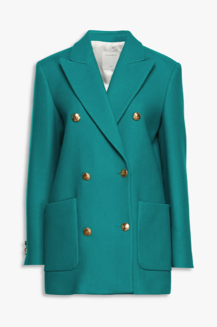 別緻的巴黎品牌 Sandro 打造法式奢華造型。這款西裝外套採用大膽的孔雀藍配色,加上微寬鬆直角的剪裁及金色雙排扣,展現時尚幹練的氣質,不論是搭配褲裝或裙子都很合適,可鹽可甜!