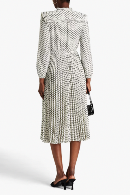法國品牌 Maje 的這款百褶連衣長裙超顯氣質!全裙佈滿黑色迷你蝴蝶結,隨著擺動會產生不同的視覺效果,讓人忍不住多看幾眼。衣領處採用歐式娃娃領,增添了可愛氛圍。簡直是氣質美女必備單品,不論是參加宴會或者見客戶都超合適!