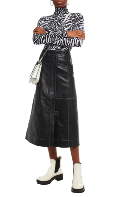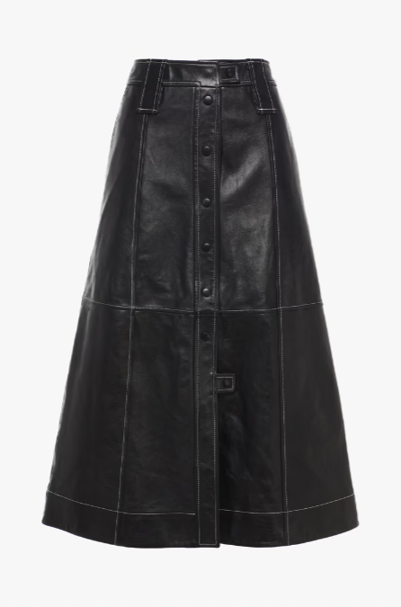 近期深受明星和穿搭博主青睞北歐小眾品牌 GANNI,重新詮釋了衣櫥必備的半身 A 字長裙,採用全皮革製造,充滿街頭酷帥風,加上白色車線設計,讓沈悶的黑色瞬間充滿時尚感。