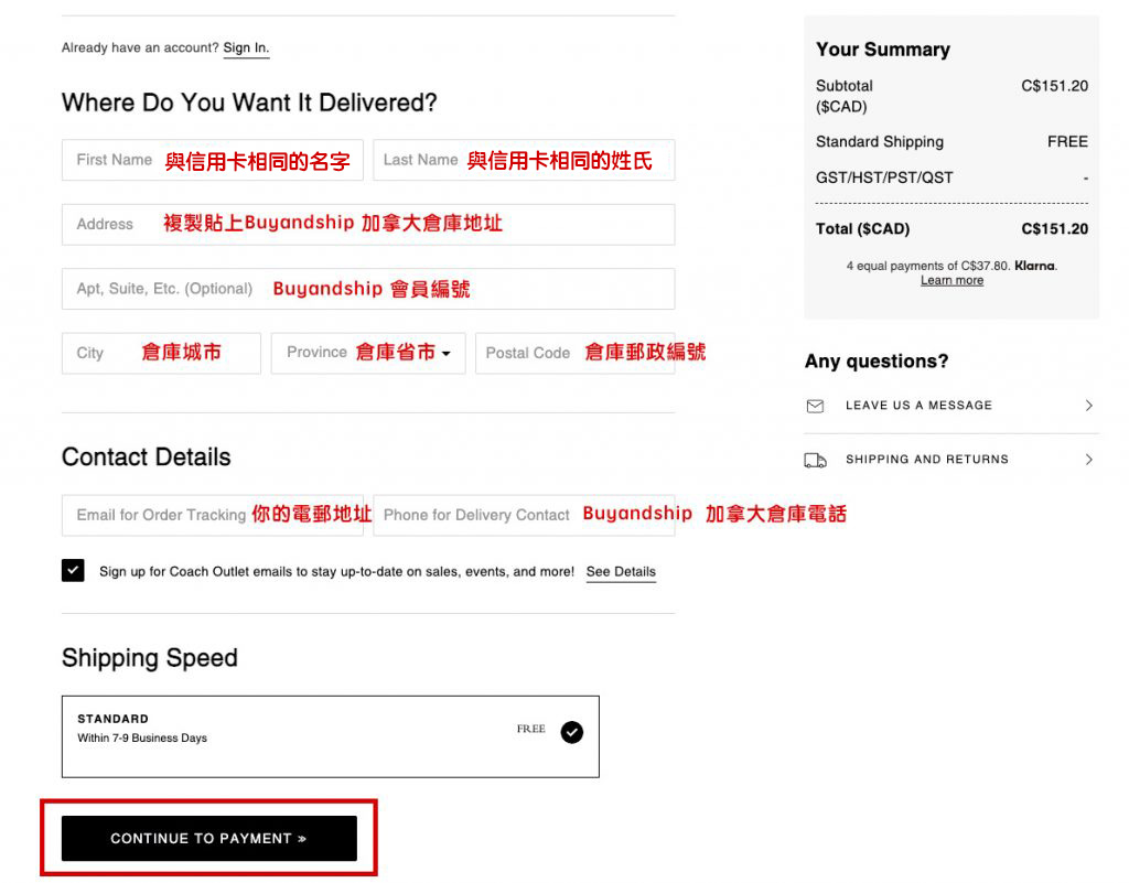 Step 5:填寫寄送資料。要打開 Buyandship官網的「海外倉庫地址」並選擇「加拿大」,以複製貼上 Buyandship 加拿大倉庫的資料。