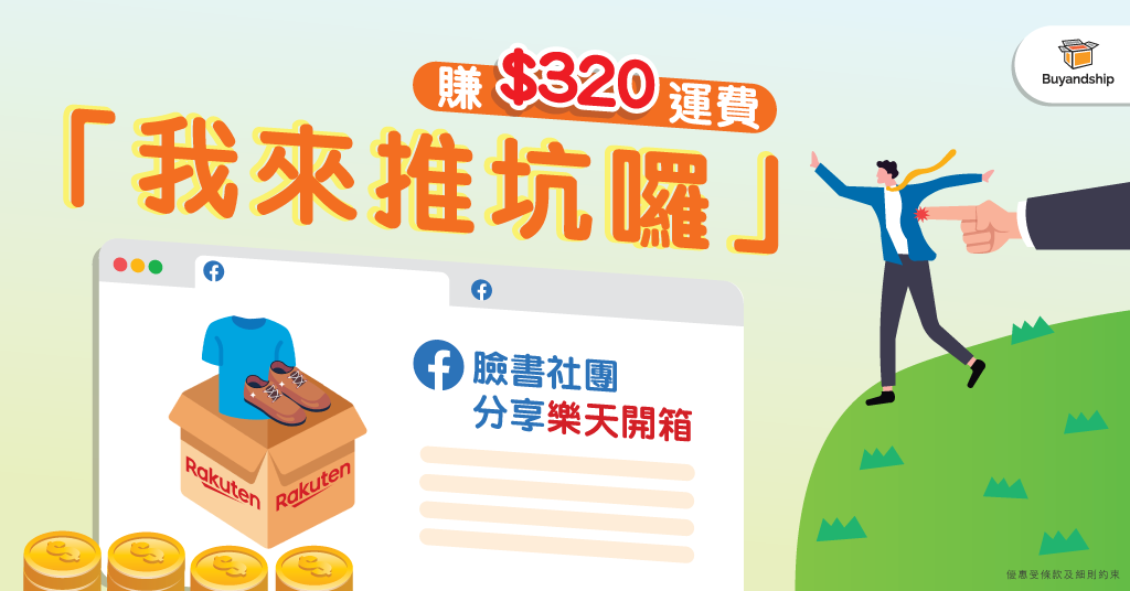 會員寶寶們常在「BNS愛揪團」上分享那麼多日本樂天的超值好康,好東西當然要傳播出去!小編誠邀您於其他 Facebook 社團分享樂天開箱,一起推其他人入坑!讓大家一同加入 Buyandship 的家庭,一起買得越多省得越多!只需在 2023 年 3 月 27 日至 4 月 16 日前完成報名並獲確認合資格的帖文,將獲得相等於 NT$320 的運費抵用金!