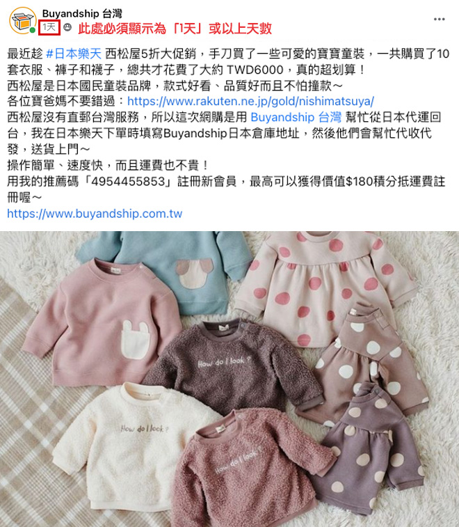 1. 文字:須註明「日本樂天」、提及商品名稱、並提及使用 Buyandship 代運回台