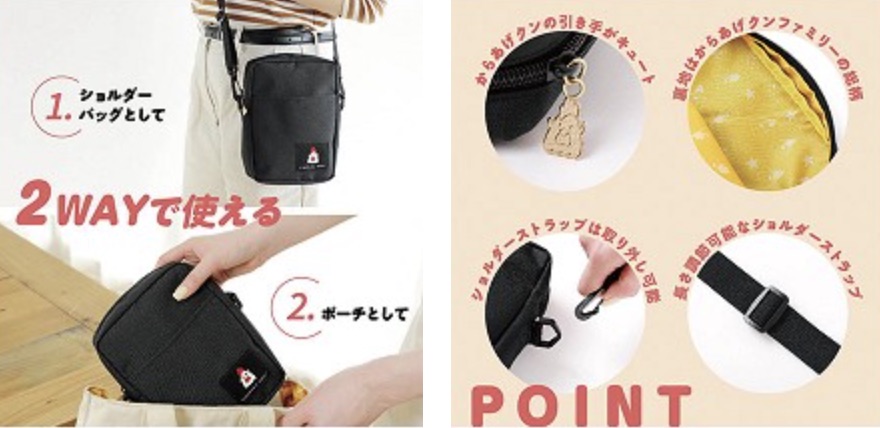 斜背包採用黑色布料耐髒又好搭,正面右下角有炸雞君圖案刺繡,連拉鍊扣都扣上了炸雞君吊飾細節滿分;而袋仔內層則選用亮眼黃作為底色,仔細一看還能見到炸雞君的可愛身影。