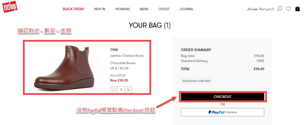Step 4:Step4. 款式、數量、金額確認後,點擊CHECKOUT按鈕 (有PayPal帳號建議使用PayPal付款)。