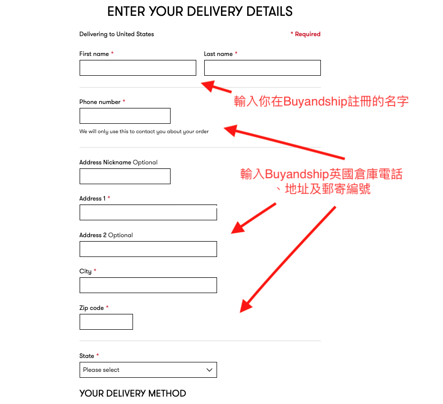 Step 6:輸入Buyandship註冊名字、英國倉庫收貨地址、電話及郵寄編號等詳細資料。