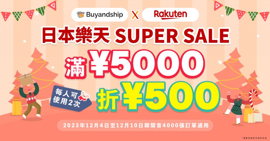日本樂天每三個月才有一次的超大規模Super Sale回歸!Buyandship獨家爭取到日本本土最大購物平台之一樂天市場(www.rakuten.co.jp)推出限量 4000 張的滿額現折優惠券,當中超過 50,000 間人氣店鋪參加,每個帳號可以使用 2 次,好好把握年底時機入手心頭好!