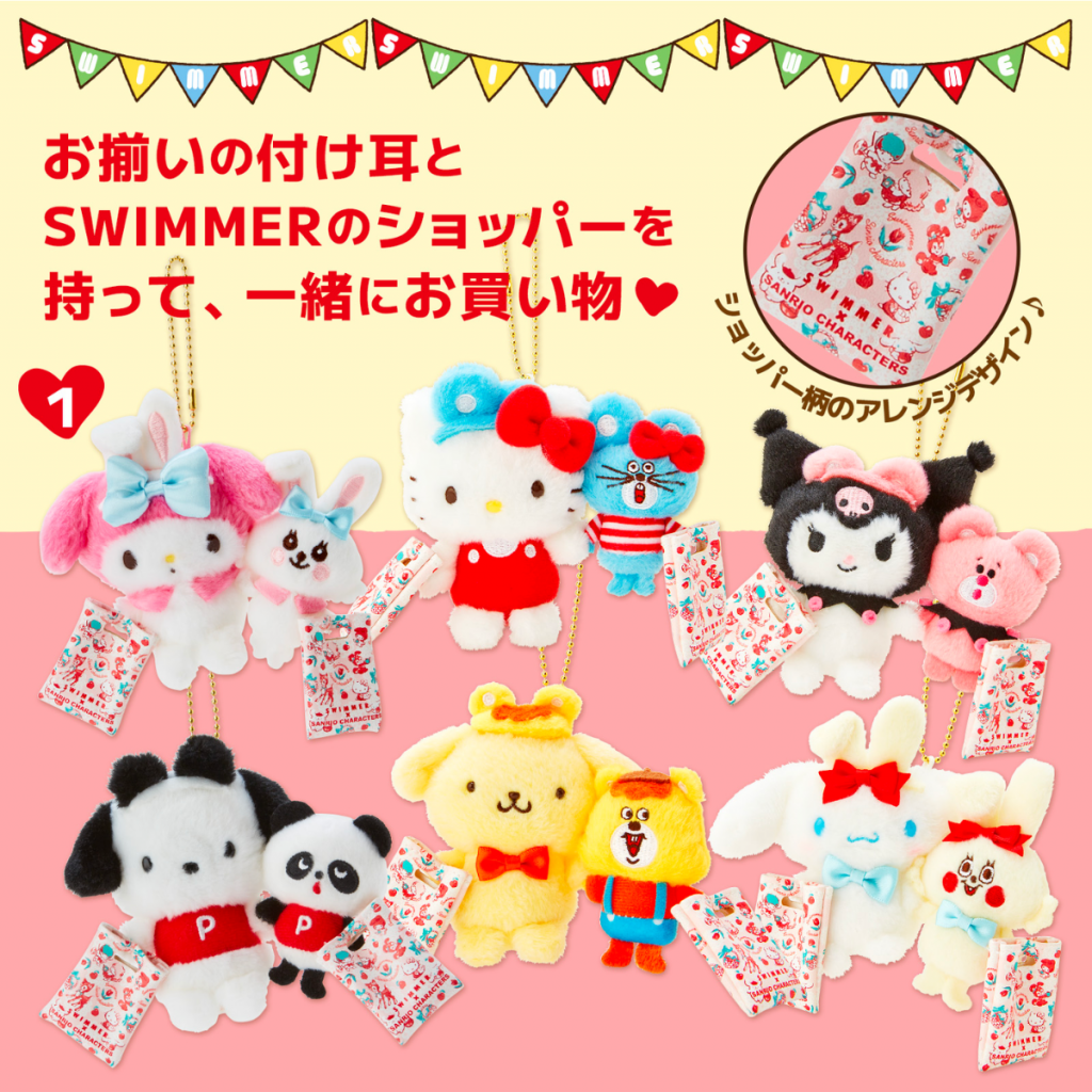 一套6款的SWIMMER x SANRIO 手牽手鎖匙扣,角色手上還拿著SWIMMER的禮品袋,超有細節~