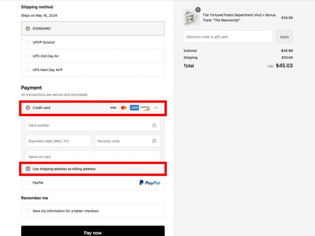 前往 Taylor Swift 美國官方網店,將想買的貨品加到購物車後前往結算頁面。