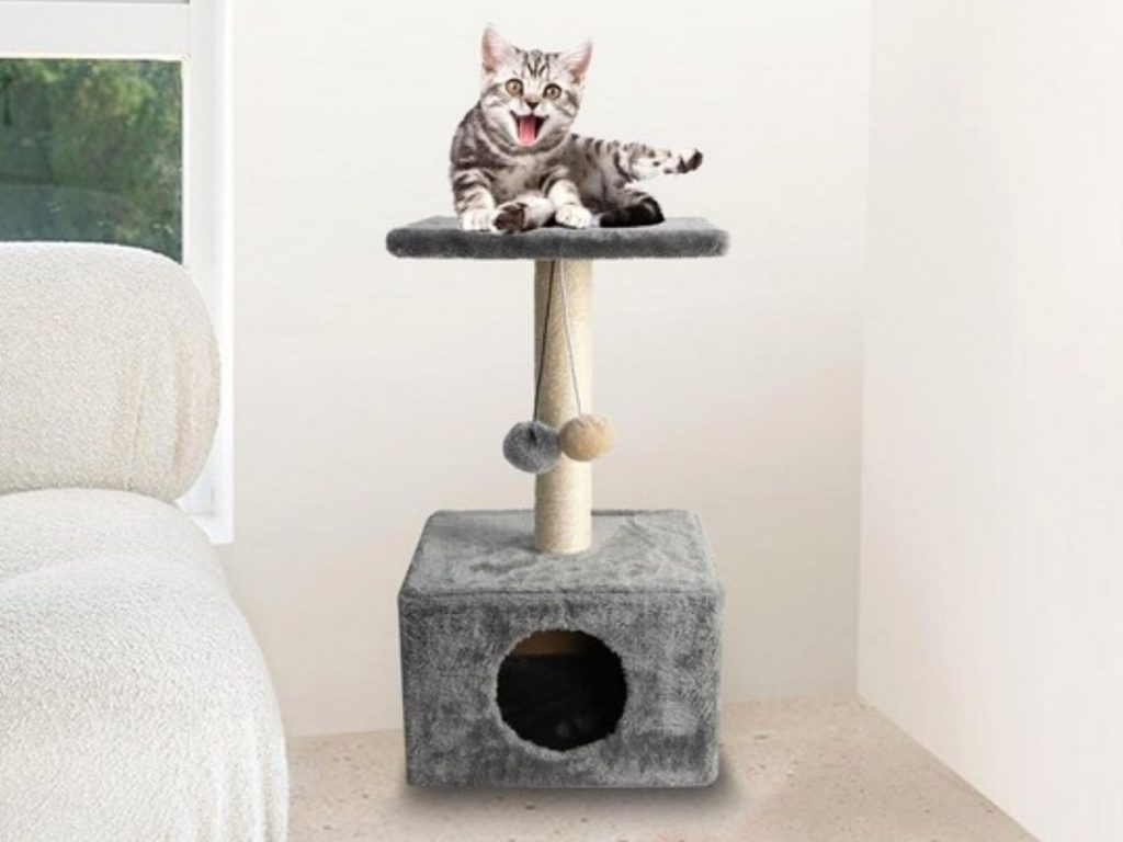 輕巧細小但安全有稱定感,顧客回饋也說好,貓咪騎在上面也不會輕易跌倒!使用了順眼又耐髒的灰色,並以纖維板及棉麻等物料製成,記得留意尺寸喔!