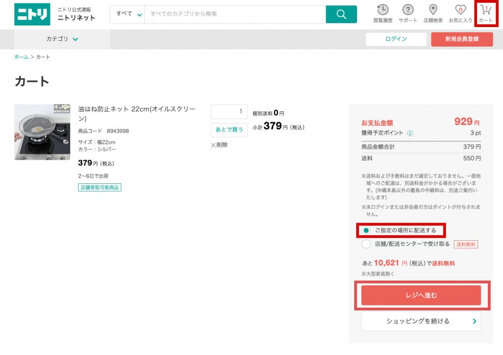 ご指定の場所に配送する」再點擊紅色按鍵「レジへ進む」進入付款程序。