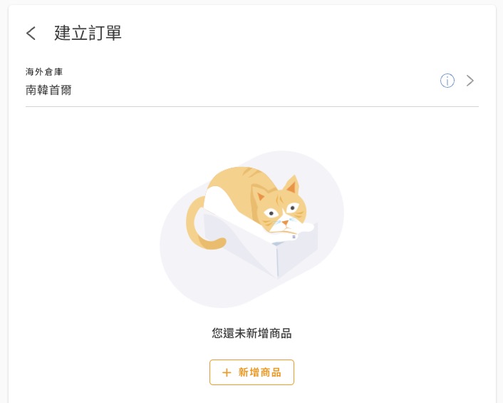 選擇你想下單的網站所在地區倉庫,點擊「新增商品」,下方教學將以韓國商品訂購為例。