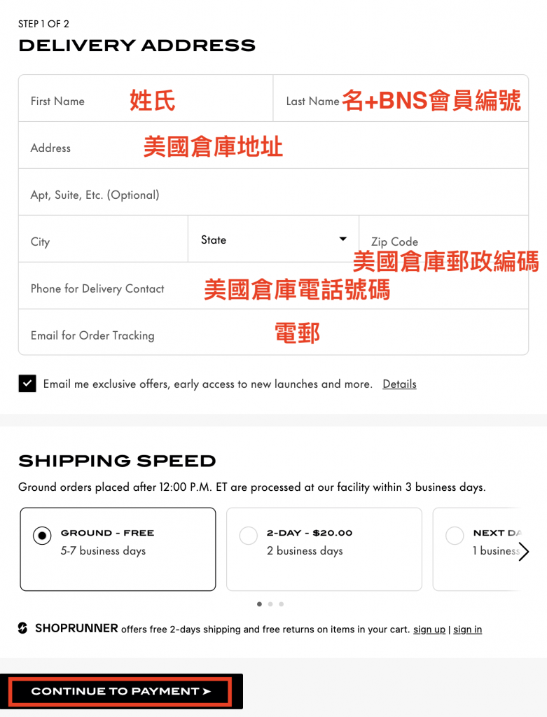 姓名部分,除了自己的名字,還要填寫Buyandship會員編號(e.g. TWXXXXXX)。