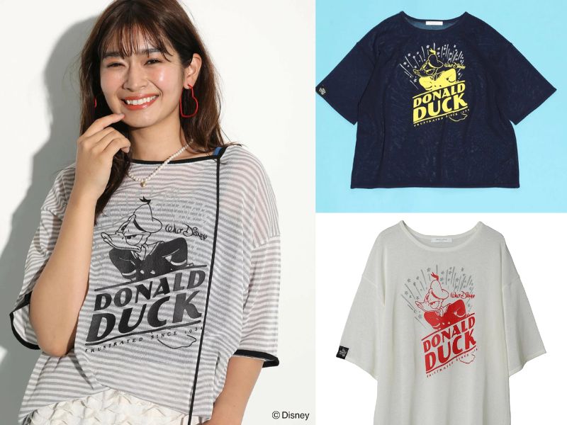 以唐老鴨的大圖案印花為設計亮點,輕薄透氣的材質,為整體造型增添輕盈感。此款上衣採用舒適親膚的針織面料,並帶有微微的透視效果,展現夏日清爽的時尚風格。