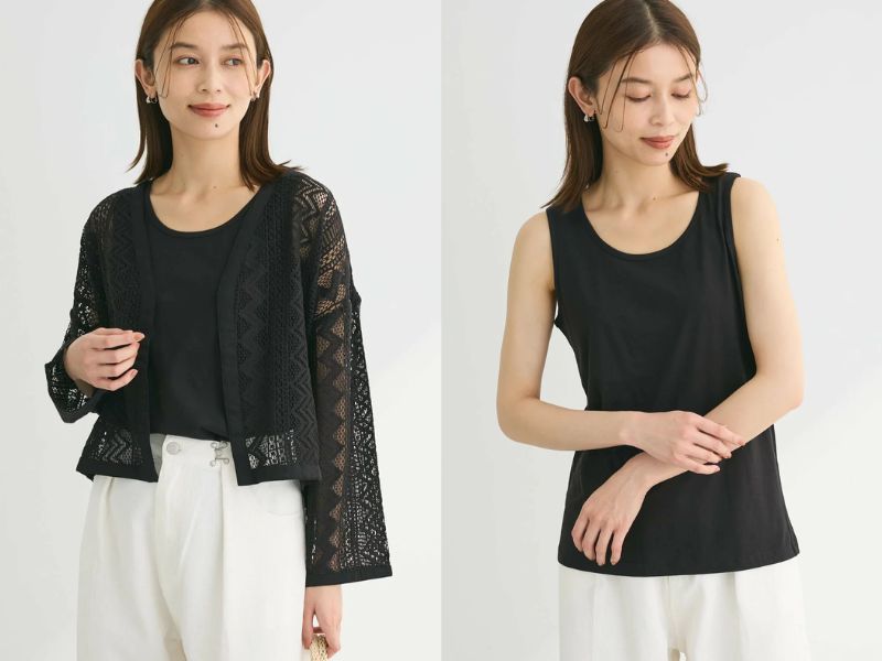 輕盈透視的蕾絲罩衫,搭配簡約的圓領背心,輕鬆打造出時尚的層次感。罩衫和背心長度不同,可相互搭配,也可單獨穿搭,展現多樣風格。百搭的黑灰米色是辦公室必備裝。