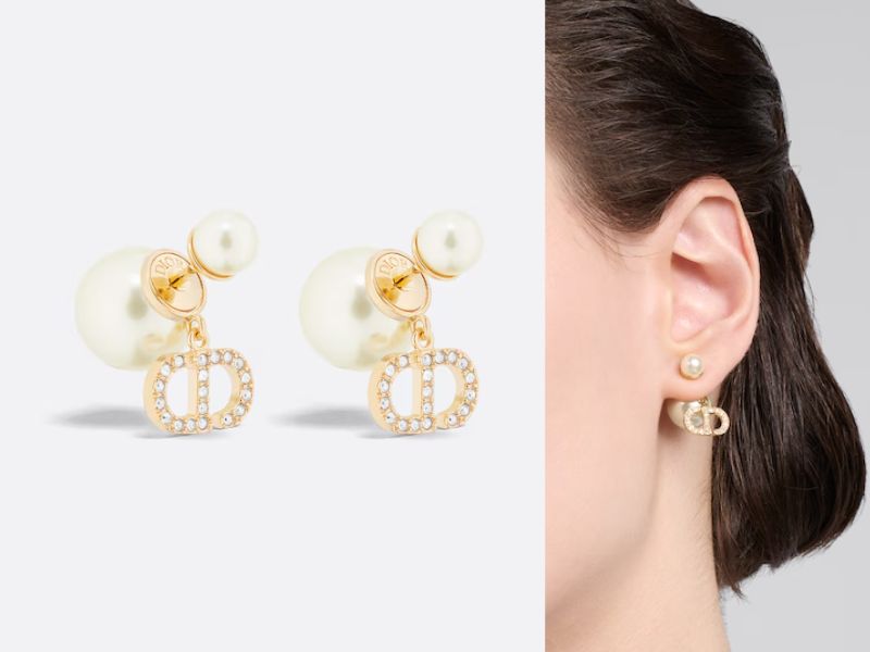 歐洲製造,正面白色樹脂珍珠點綴金色 CD 標誌,搭配閃耀的銀色調水晶,優雅而別緻。背面則採用一體式圓珠按扣,佩戴舒適。另有粉色可選。