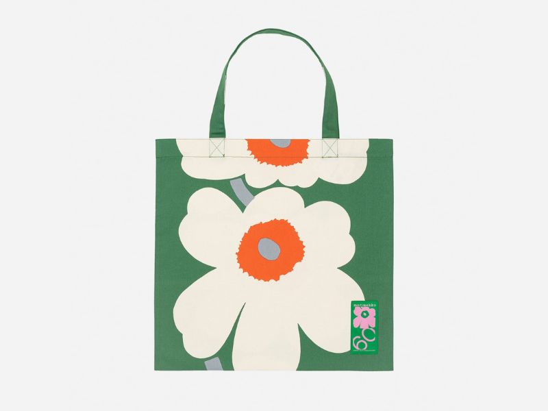 為紀念 Unikko 成立 60 週年而設計的布袋!圖形以綠色和白色為基礎,因為它可以容納錢包、手機等必需品,非常適合短途外出使用~
