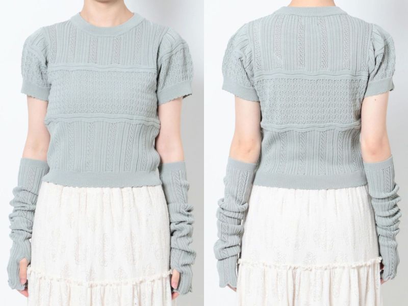 可愛的短袖針織上衣套裝,手套可戴可除,打造不同風格!隨意搭配褲子、喇叭裙或迷你裙都好看,少女感滿滿~