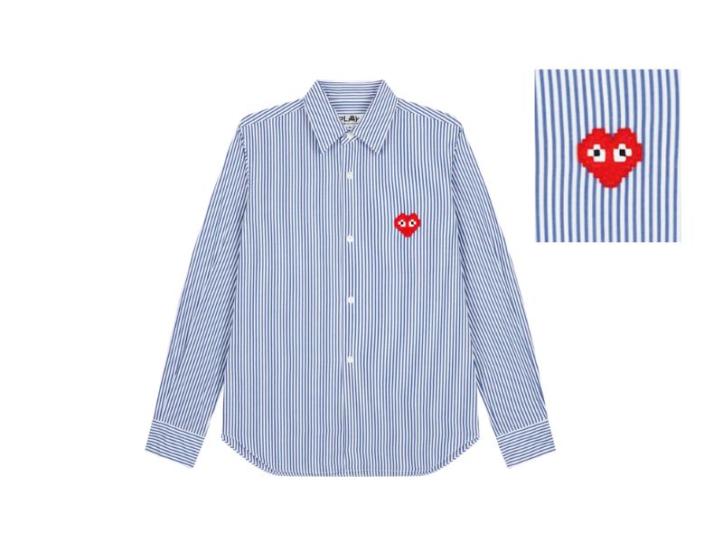 PLAY CDG 與 INVADER推出了一系列聯名款式,這件直間恤衫將經典的條紋設計,結合 INVADER 標誌性的像素愛心圖案刺繡,為這款襯衫注入了街頭藝術的活力。