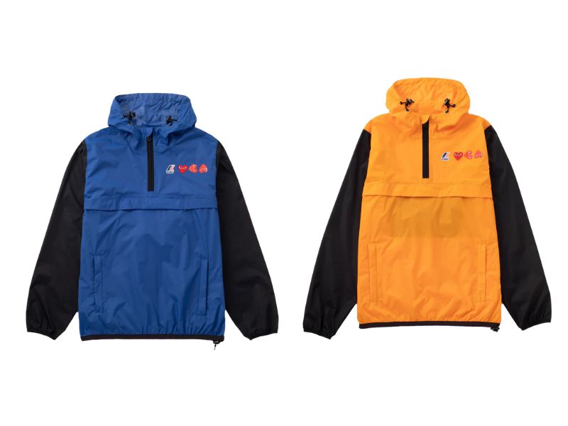 這款聯名的半拉鍊外套,採用了 K-WAY 標誌性的輕便尼龍材質,具備防風、防潑水功能,並在胸口處飾有 Play 經典的紅色愛心 Logo 刺繡。