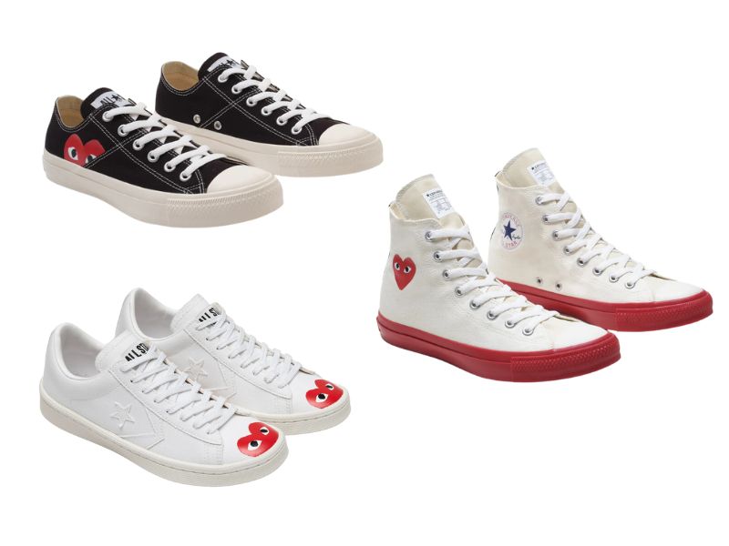 以Converse經典鞋型為基礎,注入 Play 的標誌性元素。該系列包含 All Star, Chuck Taylor及Pro Leather三種鞋型,並有高低筒及黑白色選擇。每雙鞋款皆飾有 CDG Play的紅色愛心 Logo。