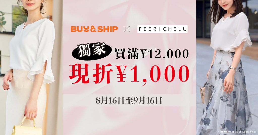 喜愛日系服飾的你注意啦!FEERICHELU是日本知名女裝品牌,以優雅舒適的日常服飾著稱。適逢FEERICHELU正在夏季進行減價,現在連同Buy&Ship獨家優惠券入手更加划算!8 月 16 至 9 月 16 日期間,Buy&Ship會員於日本女裝品牌 (feerichelu.jp) 輸入優惠代碼[ABFC22]單筆訂單可享購滿 ¥12,000 即可享 ¥1,000 折扣優惠*,活動期間每一個用戶可享一次優惠!