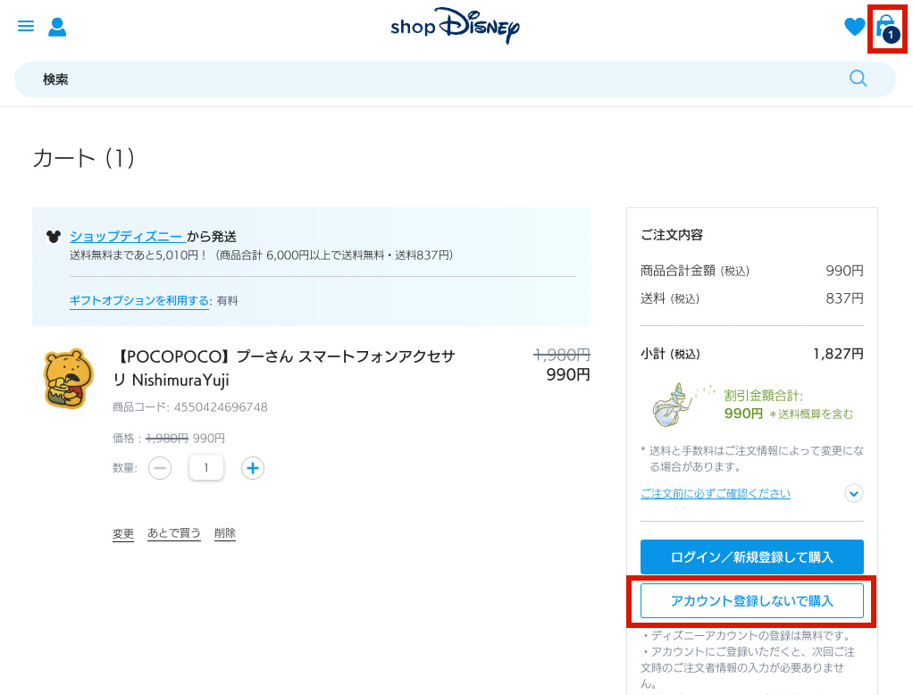 完成選購後點擊頁面右上角的購物袋圖案進入購物車,然後點擊「アカウント登録しないで購入」(以訪客身分購買)。