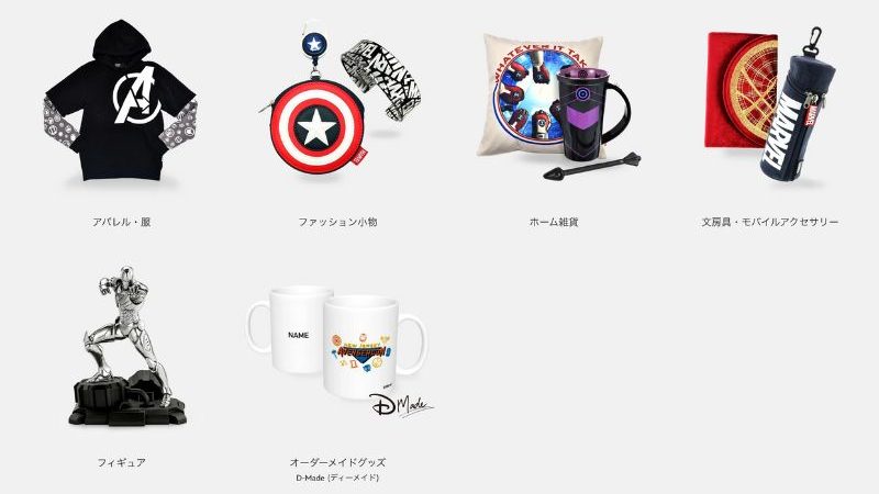 日本 Disney Store 有售漫威電影角色,例如Iron Man、美國隊長、復仇者聯盟、蜘蛛俠的服裝、時尚配件、居家雜貨、文具、手機配件等商品。