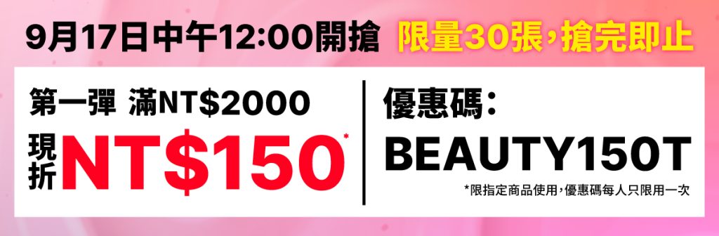 從 9 月 16 日至 9 月 30 日,一連兩個禮拜,每週一中午 12 時上架新的優惠套裝;9 月 17 日週二中午 12 時則會發放限量優惠券,會員需輸入指定輕鬆購買優惠碼,搶購滿 NT$2,000 現折 NT$150 優惠券。優惠券限「美妝狂歡購物節」商品及「恆常 DFS 美妝」產品可使用,每位用戶只限使用一次,用完即止!