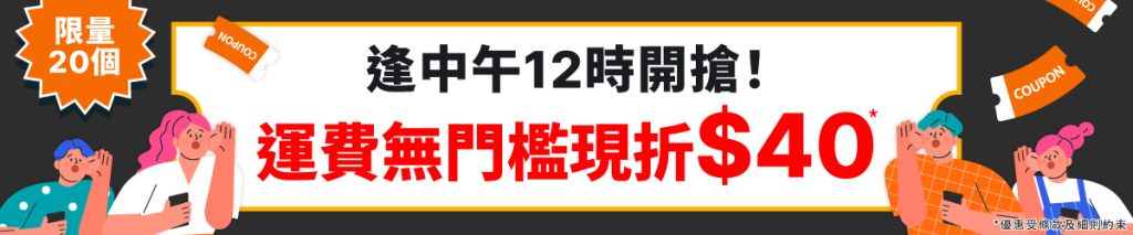 - 運費優惠碼不適用於支付輕鬆購買及代購訂單,且不可兌換現金或 Buy&Ship 積分。優惠碼數量有限,先用先得。
