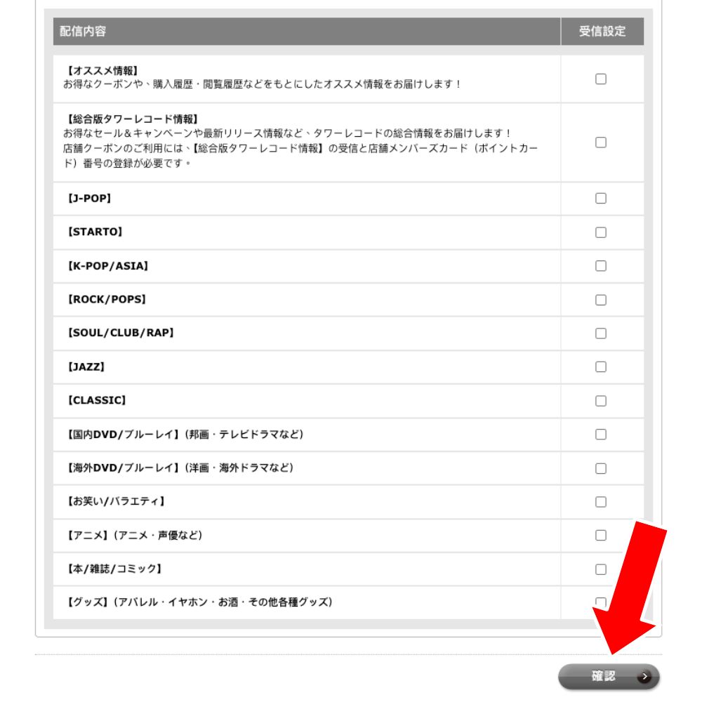 勾選想接收的宣傳郵件類別(如 J-POP、K-POP 等),點擊頁面下方的確認按鈕。