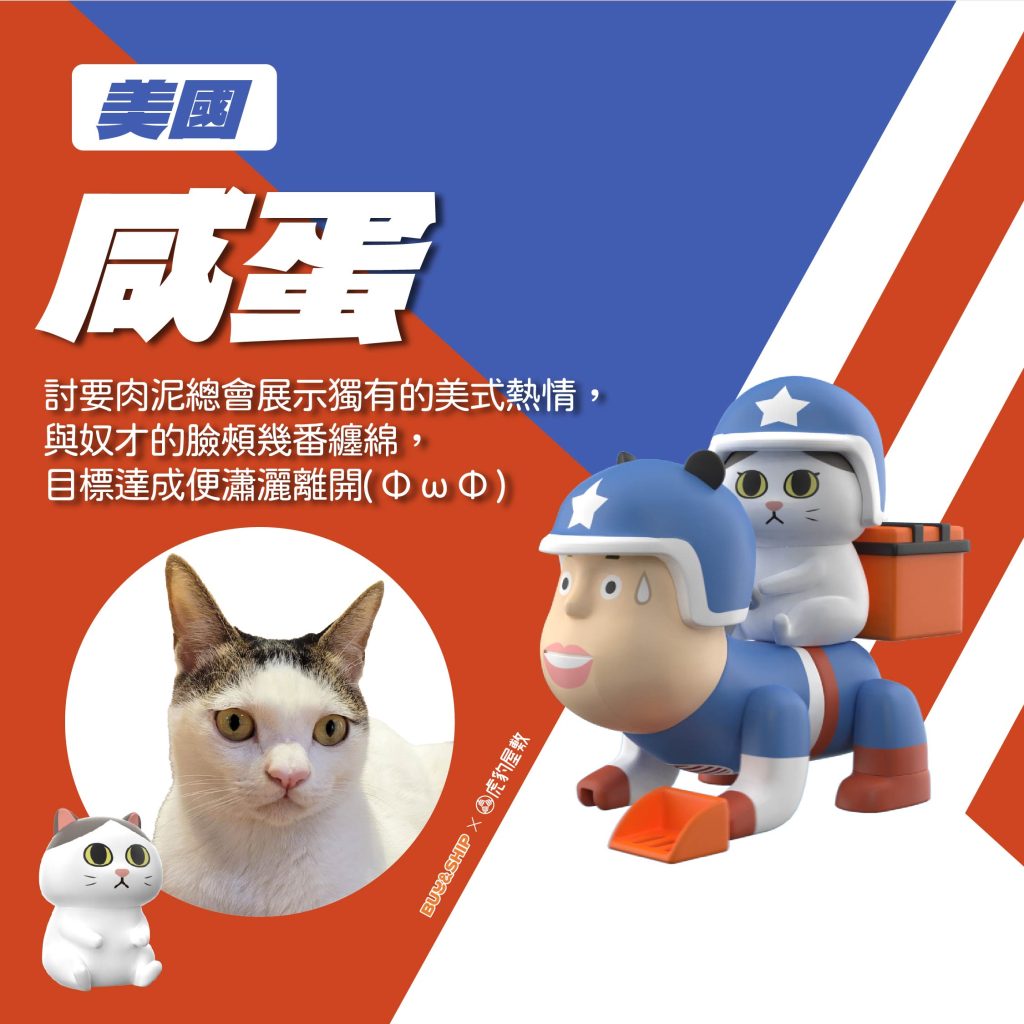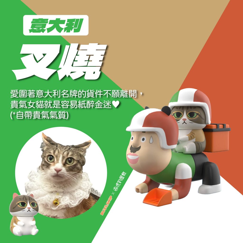每隻貓咪具有不同性格,戴上不同國家國旗的安全帽為你派送貨件,一表「屎命必達」的誠意~