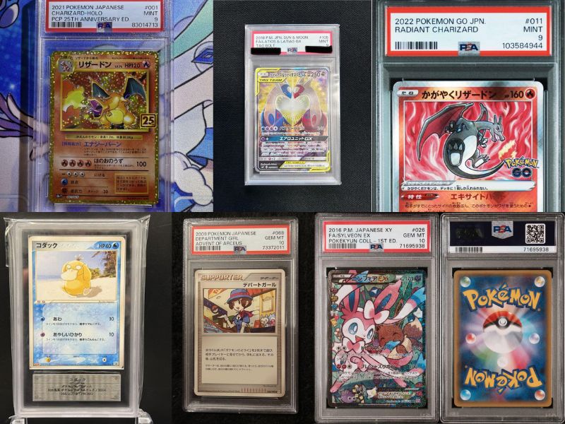 大量經 PSA 鑑定的寶可夢卡,像是入門必收的 25 週年紀念的「噴火龍 Promo 卡」與「皮卡丘 GX」等重印經典角色卡牌,還有高人氣訓練家卡如「瑪俐的自豪」、「竹蘭(シロナ)SR」等長年位列高價收藏榜的精美卡牌。