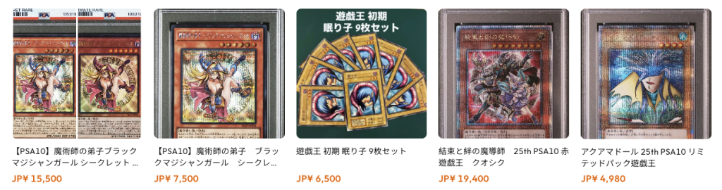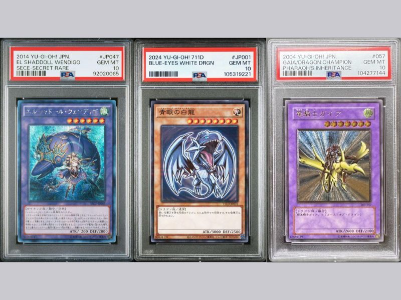 很多遊戲王(Yu-Gi-Oh!)的 PSA 鑑定卡與初期絕版珍品,像是超人氣角色「黑魔導女孩」的 PSA10 卡、初期「青眼白龍」與「真紅眼黑龍」等擁有極高市場熱度的經典怪獸卡。