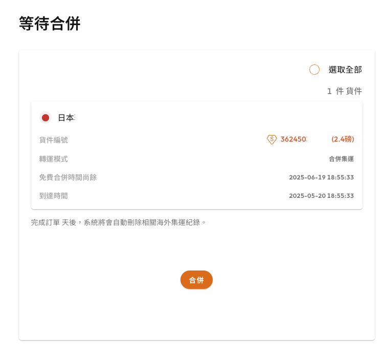 待貨件到達台灣後,您可以點擊「等待合併」來合併所有商品。支付運費後,商品即可宅配送到您的家中。