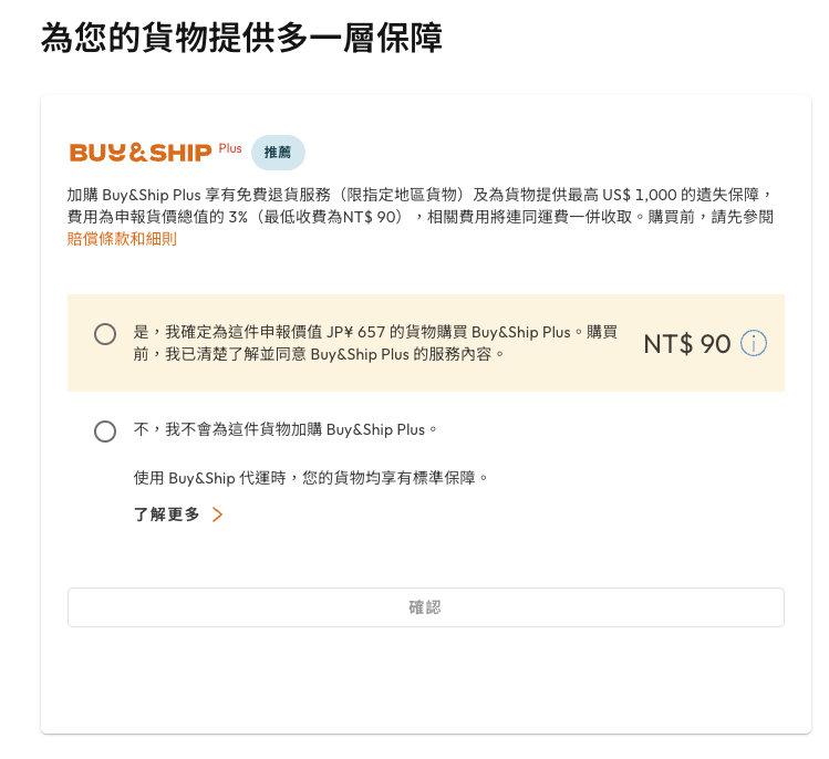 選擇是否需要加購 Buy&Ship Plus 為您的貨件提供多一層保障。