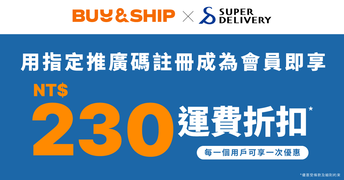 想為商店拿貨或有意創業,又對日本貨品充滿興趣?Buy&Ship 助你發展鴻圖大計!用指定推廣碼於 Buy&Ship 註冊成為會員後,即可享 NT$230 運費折扣*!每一個用戶可享一次優惠,讓你可以於日本大型 B2B 批發網站 Super Delivery (www.superdelivery.com) 盡情購物,並通過 Buy&Ship 轉運回台!