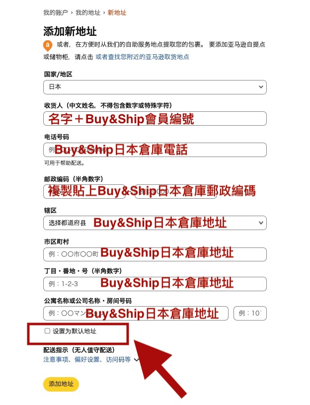 按圖中指示,將 Buy&Ship日本倉庫資料複製貼上至日本 Amazon 的地址簿。為方便日後購物,可點選設置為默認地址。
