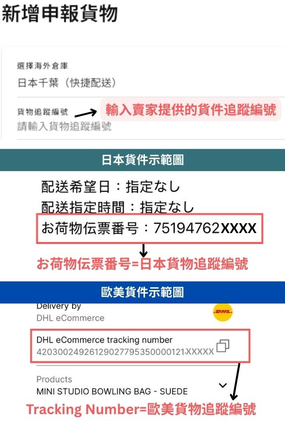 輸入賣家發貨時提供的「貨件追蹤編號」,然後按下「新增產品」,再填寫商品資訊進行申報。