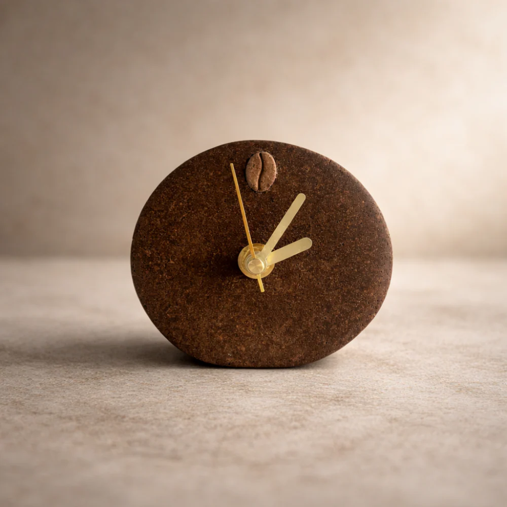 以咖啡渣再製的 COFFEE STONE 製成,搭配以咖啡果皮製作的豆形裝飾部件,整體造型自然簡潔,既是時計,也是空間中的小巧點綴。適合放在書桌、床頭或玄關位置,為日常加入溫柔節奏。